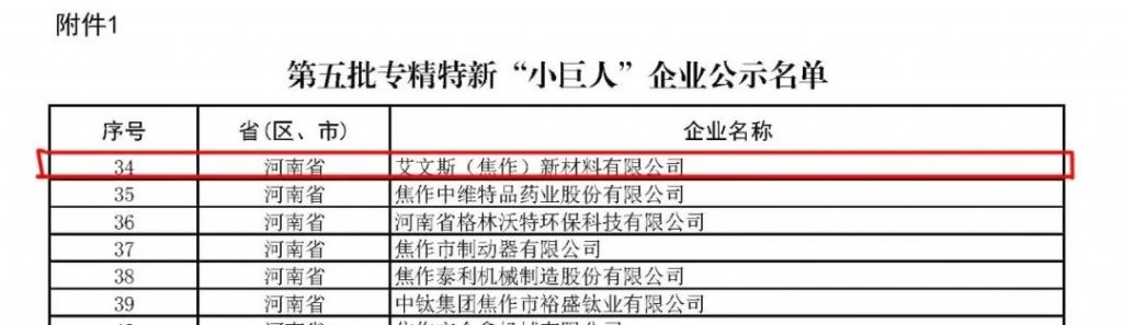 近日,根據(jù)工業(yè)和信息化部統(tǒng)一部署,河南省工信廳發(fā)布了《關(guān)于河南省第五批專精特新“小巨人”企業(yè)和第二批專精特新“小巨人”復(fù)核通過企業(yè)名單的公示》,艾文斯(焦作)新材料有限公司成功入選第五批專精特新“小巨人”企業(yè)名單。