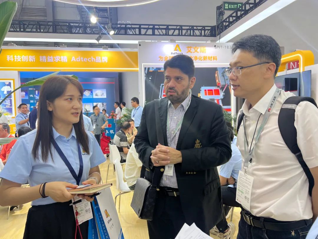 在產(chǎn)品展示臺前,無論是過濾材料還是凈化裝備,銷售人員向觀展客戶耐心細致地講解艾文斯產(chǎn)品的應用領域、產(chǎn)品特性及核心技術。
