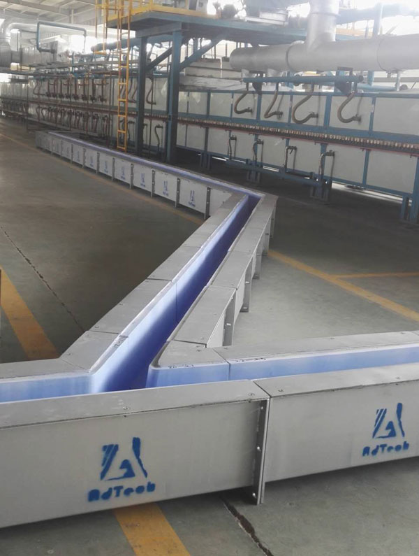 流槽內(nèi)襯采用組合結(jié)構(gòu),直流槽內(nèi)襯通常為600mm/節(jié),同時(shí)提供相同截面尺寸的彎頭、三通變徑等。